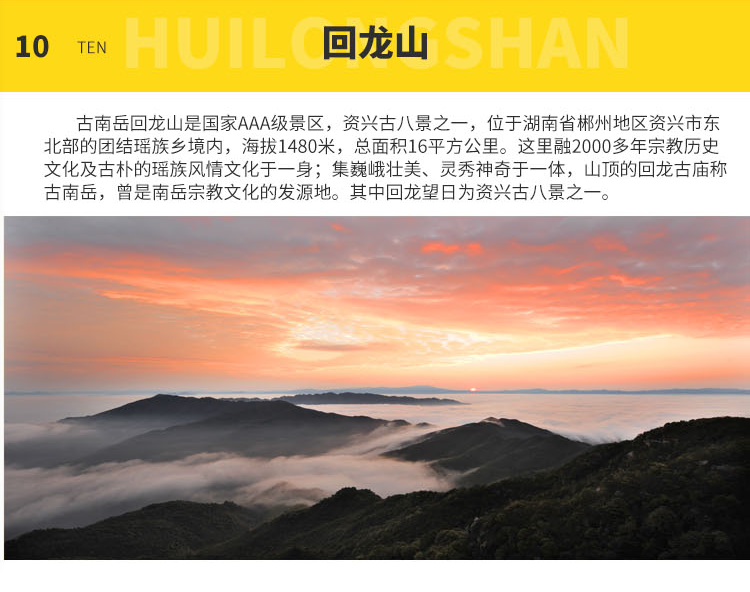 古南岳回龍山景區(qū)是國(guó)家AAA級(jí)景區(qū),2000多年前南岳在此發(fā)源,是當(dāng)時(shí)道教圣地,如今是眾多戶外攝影圣地,回龍望日更是資興的古八景色之一。