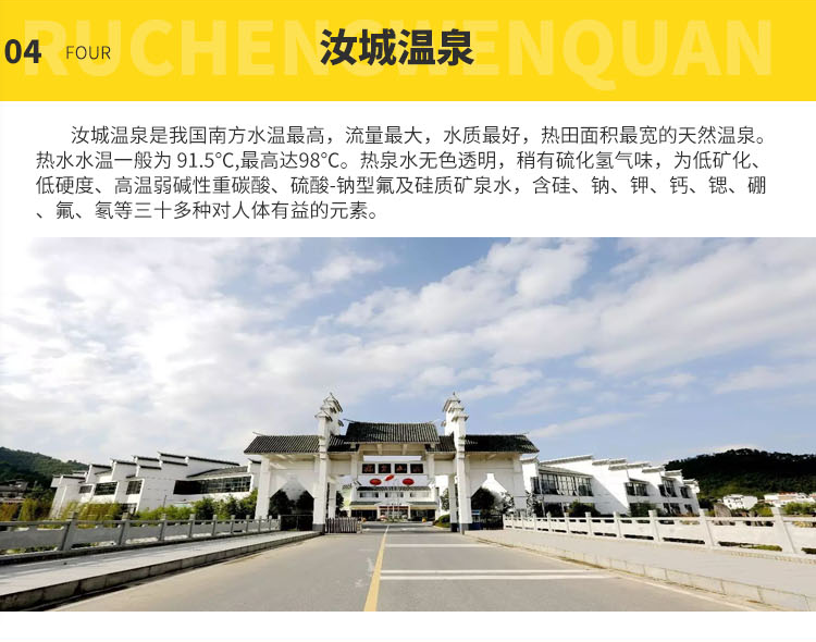 汝城溫泉我國(guó)少有的“氡泉”,享有華南養(yǎng)生第一泉的美稱(chēng)。2006年被評(píng)為國(guó)家AAAA級(jí)景區(qū),2007年被評(píng)為國(guó)家四星級(jí)農(nóng)莊,2012年獲批湖南省省級(jí)風(fēng)景名勝區(qū),2017年榮獲中國(guó)溫泉金湯獎(jiǎng)——最佳環(huán)保溫泉獎(jiǎng)。