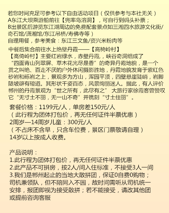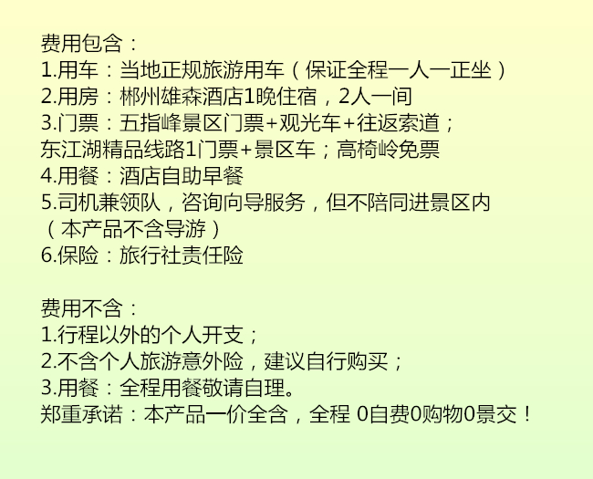 DAY1:郴州市區(qū)接團(tuán)一莽山·五指峰景區(qū)一入住郴州雄森酒店8點(diǎn)左右郴州市區(qū)(具體時(shí)間地點(diǎn)以出發(fā)前一天工作人員通知為準(zhǔn))接貴客前往【莽山·五指峰景區(qū)】,由中景信集團(tuán)的歷數(shù)三年,巨資投入、超前規(guī)劃、人性設(shè)計(jì)、精工建設(shè)及匠心打造,南中國(guó)最長(zhǎng)懸空棧道:總長(zhǎng)約8公里,海拔1400米至1600米,兩層棧道,全程無(wú)障礙觀光環(huán)線(xiàn),登高山、臨絕壁如履平地,盡享“非人”奇遇。乘坐中國(guó)目前最長(zhǎng)索道單線(xiàn)的觀光纜車(chē);游玩時(shí)間約5小時(shí)。中餐晚餐自理,晚上入住郴州雄森國(guó)際假日酒店。第二天:霧漫小東江一龍景峽谷一高椅嶺--郴州送團(tuán)早上6點(diǎn)半左右酒店接團(tuán)前往【霧漫小東江】,偉大的思想家孔子曾經(jīng)說(shuō)過(guò)“仁者樂(lè)山,智者樂(lè)水”而東江湖正是有山有水它集江南名山秀水的旖旎風(fēng)光于一體,自然景觀與人文景觀交相輝映。景區(qū)面積200平方公里,160平方公里的湖面煙波浩淼平均水深51米,最深處達(dá)157米,蓄水量達(dá)81.2億立方米的湖水 晶瑩透澈,被譽(yù)為“湘南洞庭”,數(shù)十個(gè)島嶼星羅 其中,被稱(chēng)為“東方瑞士“溫馨提示:霧漫小東江屬于溫差產(chǎn)生的自然景觀,可遇不可求哦!景區(qū)有安排漁夫撒網(wǎng)表演哦。觀霧后沿小東江觀霧棧道往上游走到3號(hào)或者4號(hào)站臺(tái),繼續(xù)乘坐景區(qū)環(huán)保車(chē)前往終點(diǎn)站一東江大壩旅游碼頭。抵達(dá)大壩后可前往【龍景峽谷瀑布群】(參考時(shí)間約1.5小時(shí))龍景峽谷全線(xiàn)游程2.5公里??瓷阶钌絼?shì)陡峭,青山滴翠,古木參天;觀水景,一條清澈的溪流在峽谷中穿行,瀑布成群。沿途可以觀賞到煙竹山瀑布、龍景瀑、龍吟瀑、三疊瀑、龍卷瀑、鴛鴦瀑等形態(tài)各異的瀑布和古松坳、連理樹(shù)、龍鱗石等千姿百態(tài)的景點(diǎn)。