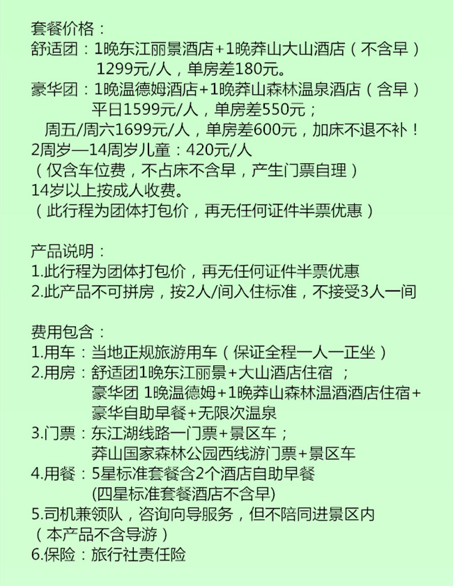 DAY1:郴州市區(qū)接團(tuán)一高椅嶺一入住酒店11點(diǎn)左右郴州市區(qū)(具體時(shí)間地點(diǎn)以出發(fā)前一天工作人員通知為準(zhǔn)!)接貴客前往【高椅嶺】,【高倚嶺村】主要紅巖綠水,赤壁丹霞,, 峽谷奇洞組成了“四面青山列翠屏、草木花光盡是香”的奇異丹霞地貌,是一個(gè)賞之叫絕、百走不厭的戶外休閑攝影勝地,丹霞地貌發(fā)育于紫紅色砂巖和礫巖之上,最觀多為方山,渾園平頂,四壁懸崖陡峭,巖腳陡坡辟有磴道。其形狀干姿百態(tài),風(fēng)景絢麗迷人。據(jù)此,有人評(píng)價(jià)郴州的丹霞景觀為“世之所有,此盡有之大旅行家徐霞客曾贊嘆它“無寸土不麗,無一山不奇并鐫刻“寸土佳麗”游畢后,前往酒店入住(舒適團(tuán)住東江湖麗景酒店豪華五星團(tuán)住郴州溫德姆酒店,如若滿房,則更換其他同等級(jí)別酒店。