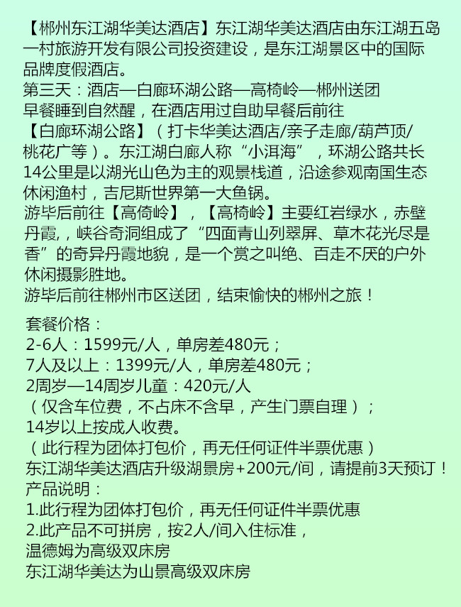DAY1:郴州接團(tuán)一仰天湖一入住國(guó)際五星溫德姆酒店12點(diǎn)左右郴州市區(qū)(具體時(shí)間地點(diǎn)以出發(fā)前一天工作人員通知為準(zhǔn)!)接貴客前往【仰天湖景區(qū)】,車程約1個(gè)半小時(shí),大約有1小時(shí)盤山公路,暈車的小伙伴提前準(zhǔn)備好暈車藥哦!景區(qū)內(nèi)游玩時(shí)間約2.5小時(shí)。游畢后前往國(guó)際五星郴州溫德姆至尊豪庭酒店入住!【郴州溫德姆至尊豪庭大酒店】郴州溫德姆豪廷大酒店是由美國(guó)溫德姆酒店管理集團(tuán)經(jīng)營(yíng)管理,是目前湖南省郴州市一家外資國(guó)際奢華品牌白金五星級(jí)酒店。