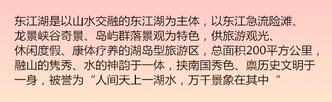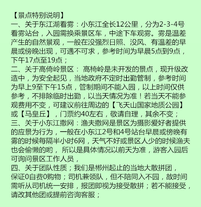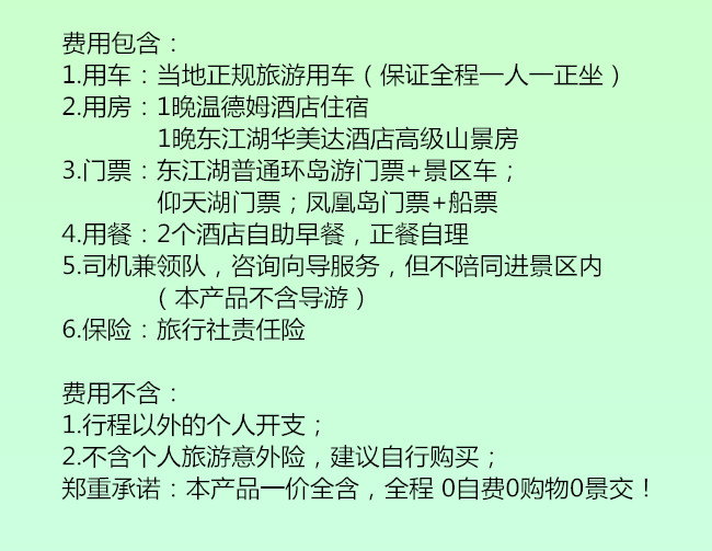 DAY2:霧漫小東江一白廊鳳凰島景區(qū)-東江湖華美達(dá)酒店7點(diǎn)左右(具體時(shí)間地點(diǎn)以出發(fā)前一天工作人員通知為準(zhǔn)!)集合前往國(guó)家5A級(jí)旅游景區(qū)【東江湖-霧漫小東江】偉大的思想家孔子曾經(jīng)說(shuō)過(guò)“仁者樂(lè)山,智者樂(lè)水”而東江湖正是有山有水它集江南名山秀水的旖旎風(fēng)光于一體自然景觀與人文景觀交相輝映。說(shuō)明:霧漫小東江屬于溫差產(chǎn)生的自然景觀,可遇不可求哦6:30-9:30,景區(qū)有按排漁夫撒網(wǎng)表演哦。觀后沿小東江觀霧棧道往上游走到3號(hào)或者4號(hào)站臺(tái),繼續(xù)乘坐景區(qū)環(huán)保車前往終點(diǎn)站--東江大壩旅游碼頭。后前往【龍景峽谷瀑布群】,龍景峽谷全線游程2.5公里??瓷骄?,山勢(shì)陡峭,青山滴翠,古木參天;觀水景,一條清澈的溪流在峽谷中穿行,瀑布成群。13:00集合前往白廊,后乘船前往【鳳凰島景區(qū)】【東江湖鳳,凰島】位于東江湖西北部,位于東江湖白廊片區(qū)湖的中央,是東江湖能在島頂360度觀湖景的地方。游玩時(shí)間約2.5小時(shí),后入住白廊華美達(dá)酒店。