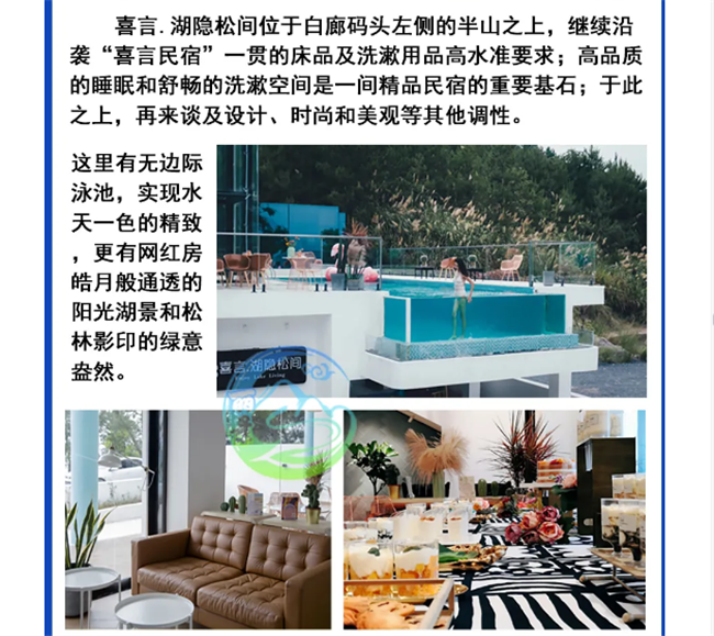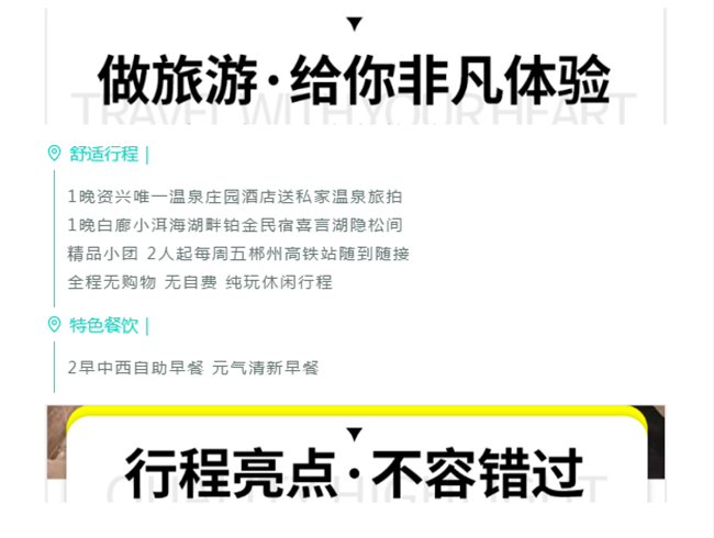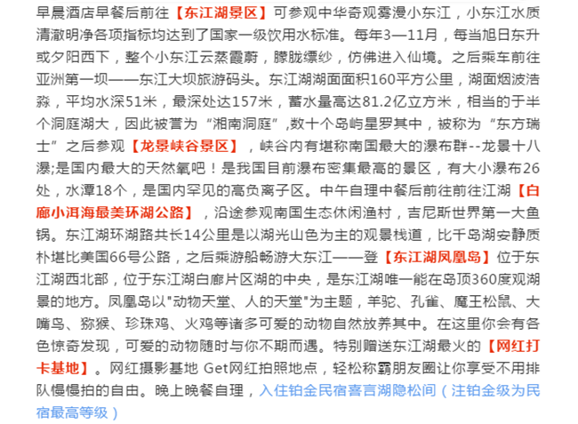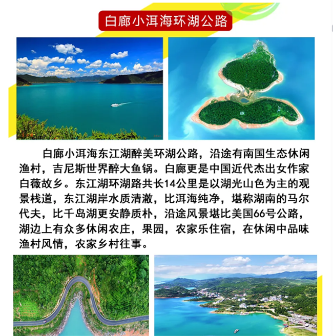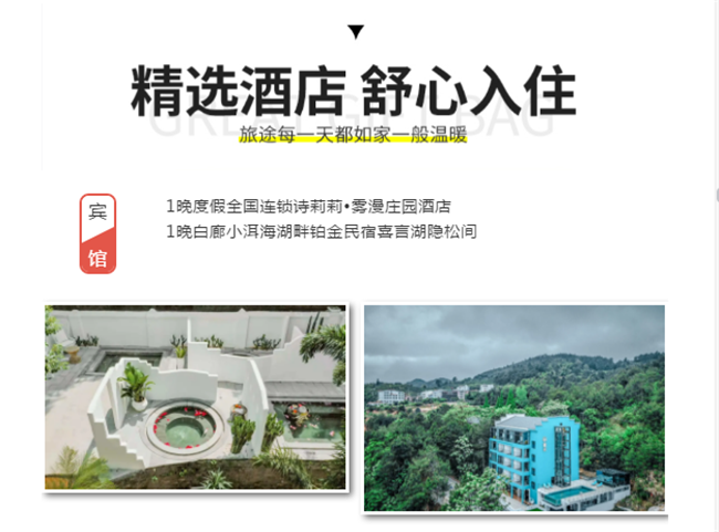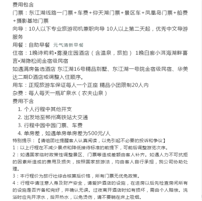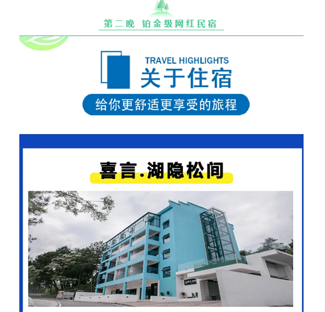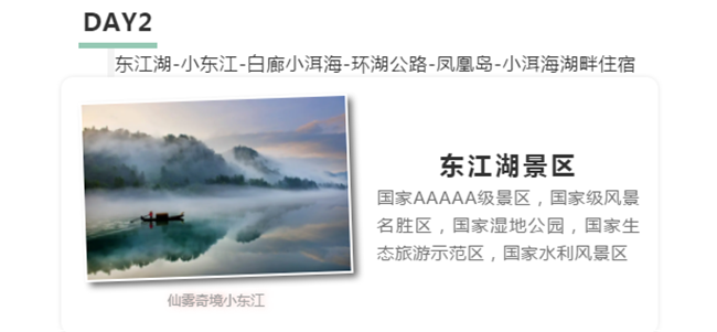 早晨酒店早餐后前往【東江湖景區(qū)】可參觀中華奇觀霧漫小東江,小東江水質(zhì)清澈明凈各項(xiàng)指標(biāo)均達(dá)到了國家一級飲用水標(biāo)準(zhǔn)。每年3-11月,每當(dāng)旭日東升或夕陽西下,整個小東江云蒸霞蔚,朦朧縹紗,仿佛進(jìn)入仙境。之后乘車前往--東江大壩旅游碼頭。東江湖湖面面積160平方公里,湖面煙波浩淼,平均水深51米,深處達(dá)157米,蓄水量高達(dá)81.2億立方米,相當(dāng)?shù)挠诎雮€洞庭湖大,因此被譽(yù)為“湘南洞庭”,數(shù)十個島嶼星羅其中,被稱為“東方瑞士”之后參觀【龍景峽谷景區(qū)】,峽谷內(nèi)有堪稱南國的瀑布群--龍景十八瀑:是國內(nèi)天然氧吧!是我國目前瀑布密集最高的景區(qū),有大小瀑布26處,水潭18個,是國內(nèi)罕見的高負(fù)離子區(qū)。中午自理中餐后前往前往江湖【白廊小洱海最美環(huán)湖公路】,沿途參觀南國生態(tài)休閑漁村,吉尼斯世界大魚鍋。東江湖環(huán)湖路共長14公里是以湖光山色為主的觀景棧道,比千島湖安靜質(zhì)樸堪比美國66號公路,之后乘游船暢游大東江--登【東江湖鳳凰島】位于東江湖西北部,位于東江湖白廊片區(qū)湖的中央,是東江湖能在島頂360度觀湖景的地方。鳳凰島以“動物天堂、人的天堂"為主題,羊駝、孔雀、王松鼠、大嘴鳥、獼猴、珍珠雞、火雞等諸多可愛的動物自然放養(yǎng)其中。在這里你會有各色驚奇發(fā)現(xiàn),可愛的動物隨時與你不期而遇。特別贈送東江湖最火的【網(wǎng)紅打卡基地】。網(wǎng)紅攝影基地 Get網(wǎng)紅拍照地點(diǎn),輕松稱霸朋友圈讓你享受不用排隊(duì)慢慢拍的自由。晚上晚餐自理,入住鉑金民宿喜言湖隱松間(注鉑金級為民宿最高等級)