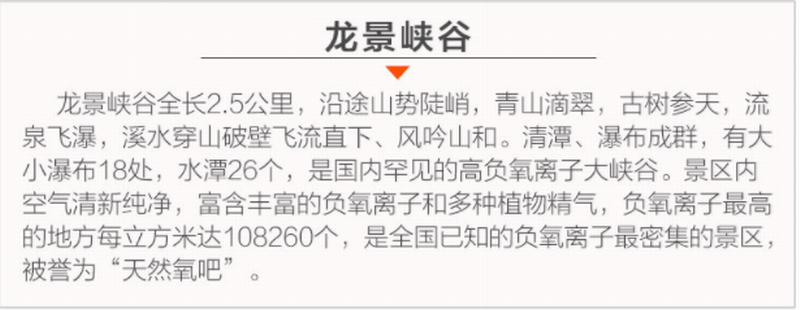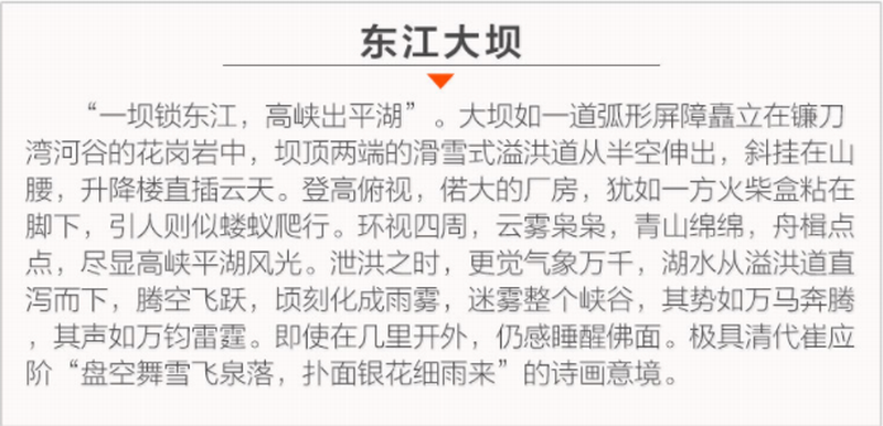 9點集合前往亞洲第一壩——東江大壩旅游碼頭。東江湖景區(qū)面積200平方公里,160平方公里的湖面煙波浩淼,平均水深51米,最深處達157米,因為水體較深,所以蓄水量相當(dāng)大。達81.2億立方米的湖水晶瑩透澈,相當(dāng)?shù)挠诎雮€洞庭湖,因此被譽為“湘南洞庭”,數(shù)十個島嶼星羅其中,被稱為“東方瑞士”。到達東江大壩旅游碼頭后前往龍景峽谷景區(qū)。龍景峽谷位于東江大壩右側(cè),峽谷內(nèi)有堪稱南國最大的瀑布群--龍景十八瀑;是國內(nèi)最大的天然氧吧!沿途山勢陡峭,青山滴翠,古木參天,清潭、瀑布成群,是我國目前瀑布密集最高的景區(qū),有大小瀑布26處,水潭18個,是國內(nèi)罕見的高負離子區(qū)。龍呤瀑、鴛鴦瀑、東江大壩等景點,中午自行在東江大壩用中餐。