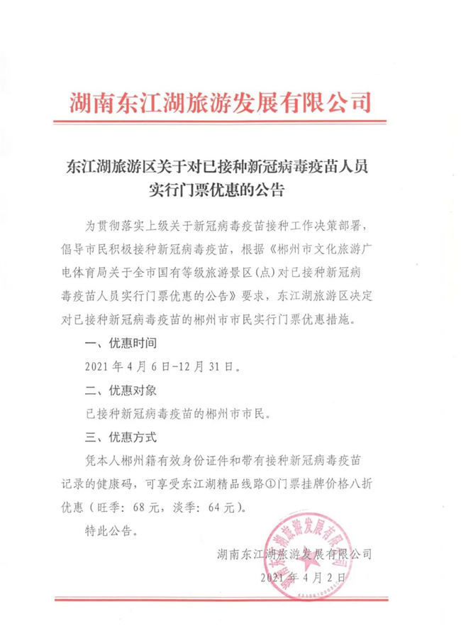 2021年4月6日-12月31日。 二、優(yōu)惠對(duì)象 已接種新冠病毒疫苗的郴州市市民。 三、優(yōu)惠方式 憑本人郴州籍有效身份證件和帶有接種新冠病毒疫苗記錄的健康碼,可享受東江湖精品線路①門(mén)票掛牌價(jià)格八折優(yōu)惠(旺季:68元,淡季:64元)。
